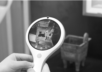 “AR探究镜”基于AR增强现实技术,展品信息的数字虚拟内容与设备后方摄像头获取的实际展品影像可融合叠加,在显示屏上为观众呈现虚实融合的视觉效果。该技术与5G结合,可在文化场所内提供实时富媒体化的新型讲解服务。新华社记者毛思倩摄