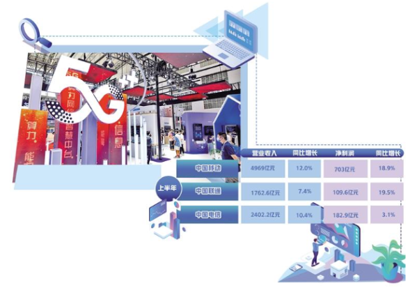记者梳理发现,三家运营商的营业收入、净利润等均实现快速增长。上半年,中国移动营业收入4969亿元,同比增长12.0%,净利润703亿元,同比增长18.9%;中国联通营业收入1762.6亿元,同比增长7.4%,净利润为109.6亿元,同比增长19.5%;中国电信营业收入2402.2亿元,同比增长10.4%,净利润182.9亿元,同比增长3.1%。