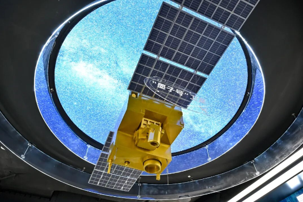 2025年7月1日,在中电信量子信息科技集团有限公司科技体验馆内拍摄的“墨子号”量子卫星模型。图/新华社记者 张铖 摄