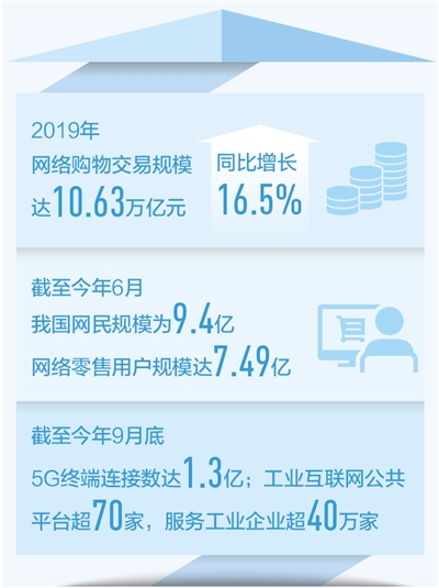 截至2020年6月,我国网民规模为9.4亿,网络零售用户规模达7.49亿。2019年网络购物交易规模达10.63万亿元,同比增长16.5%。截至今年9月底,5G终端连接数达到1.3亿;制造业数字化转型稳步前进,工业互联网公共平台超过70家,服务的工业企业超过40万家……如今,数字经济蓬勃发展,成为经济发展的新增长点,产业数字化与数字产业化的基础更加坚实,不断为高质量发展注入新动能。