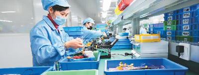 安徽省马鞍山慈湖国家高新区安徽共芯光子科技有限公司的职工正在加工用于移动5G网络的光通讯产品。王文生摄(人民图片)