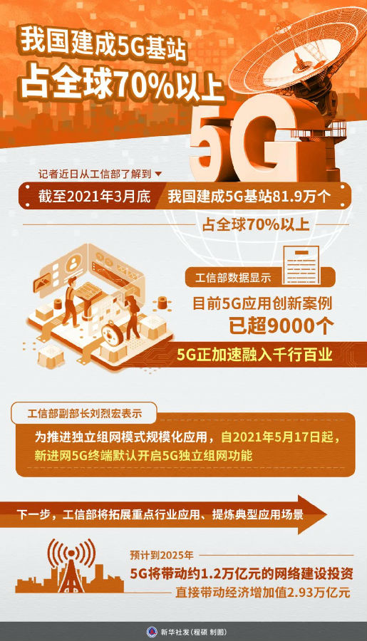 中国工信部数据显示,中国已累计建成5G基站超81.9万个,覆盖全国所有地级以上城市,建成全球规模最大的5G独立组网网络。中国信息通信研究院预计,到2025年,5G将带动1.2万亿元左右的网络建设投资,拉动8万亿元相关的信息消费,直接带动经济增加值2.93万亿元。