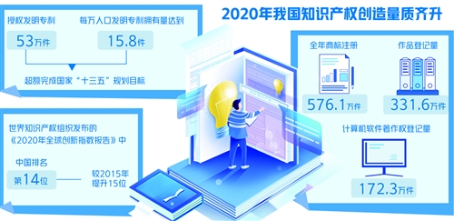 “2020年我国知识产权创造量质齐升。全年授权发明专利53万件,每万人口发明专利拥有量达到15.8件,超额完成国家‘十三五’规划目标。”国家知识产权局局长申长雨介绍,去年全年商标注册576.1万件,作品登记量331.6万件,计算机软件著作权登记量172.3万件……世界知识产权组织发布的《2020年全球创新指数报告》中,中国排名第14位,较2015年提升15位。