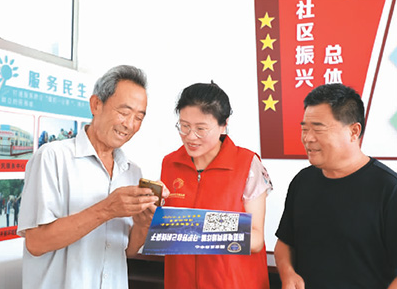 在山东省临沂市沂南县岸堤镇岸堤社区,志愿者为老年人智能手机安装反诈骗应用程序。杜昱葆摄(人民图片)