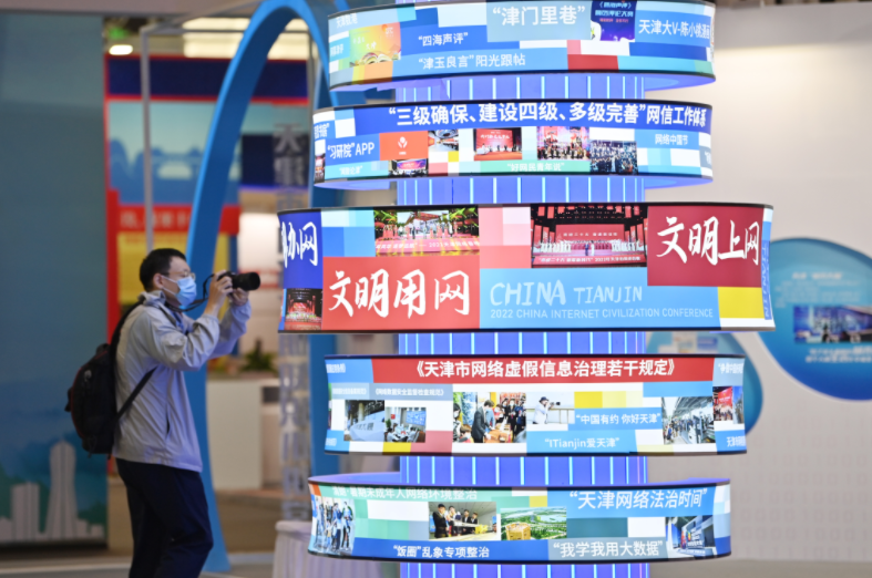 8月28日,在国家会展中心(天津),参会者在2022年中国网络文明大会现场拍摄展览。新华社记者李然摄