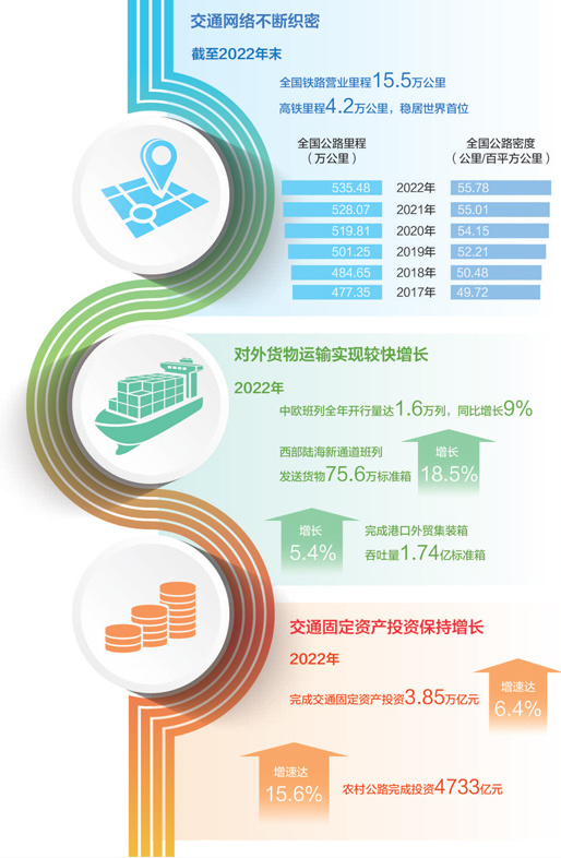 “覆盖空间大、通达程度深、惠及面广的基础交通设施网络进一步织牢,在‘末端末梢’人民群众出行、货运物流服务方面发挥了重要的保障作用。”周健说,以农村公路为例,2022年,农村公路里程增加6.54万公里,其中乡镇通三级及以上公路比例达到84%,老少边及脱贫地区公路建设有序推进,有效提高交通运输均等化水平。