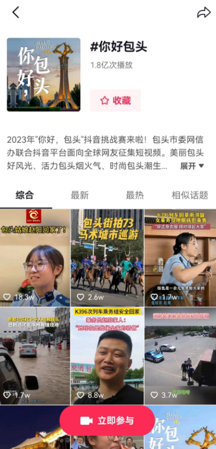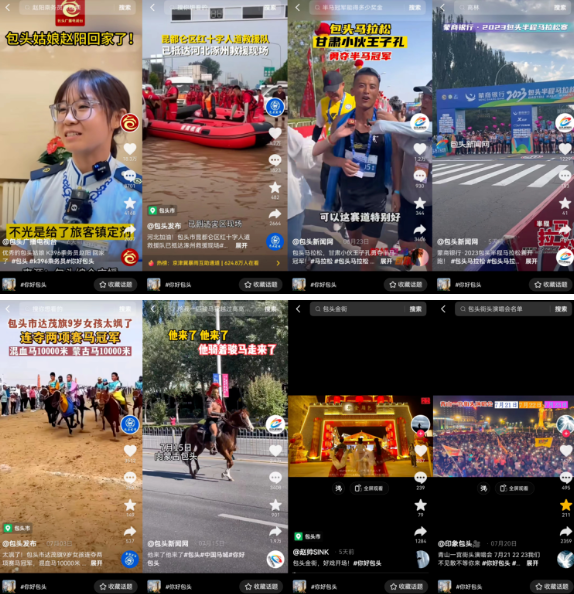 今年6月,由包头市委网信办主办,内蒙古中浩燃气、中科国智(内蒙古)有限公司承办,包头市委宣传部、市教育局、卫健委、文旅局、市场监管局、团市委等15个市直部门及10个旗县区委宣传部、网信办共同组织开展了“你好,包头”抖音挑战赛。截至8月10日,大赛抖音平台话题#你好包头历时50天播放量达1.8亿,话题视频超400个,传播效果显著,取得了网上传播阶段性成果。