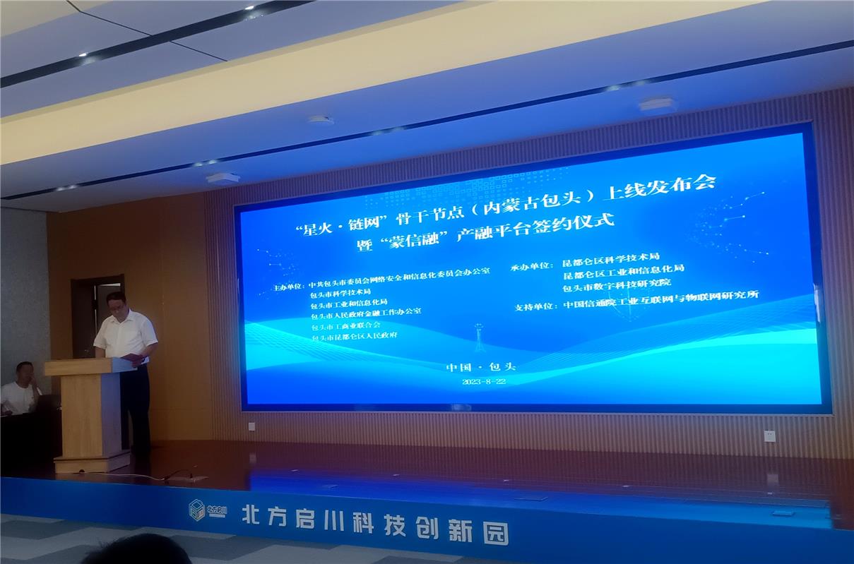 8月22日下午,国家工信部“星火·链网”骨干节点(内蒙古包头)上线发布暨“蒙信融”产融平台签约仪式在北方启川科创园隆重举行,标志着内蒙古自治区首个国家级数字新基建项目落地,将有力推动包头在产业金融、高端制造、新能源、新材料、智慧农牧、新消费等领域数字化转型升级,为包头乃至西北地区数字经济发展提供可复制的新模式与新业态。