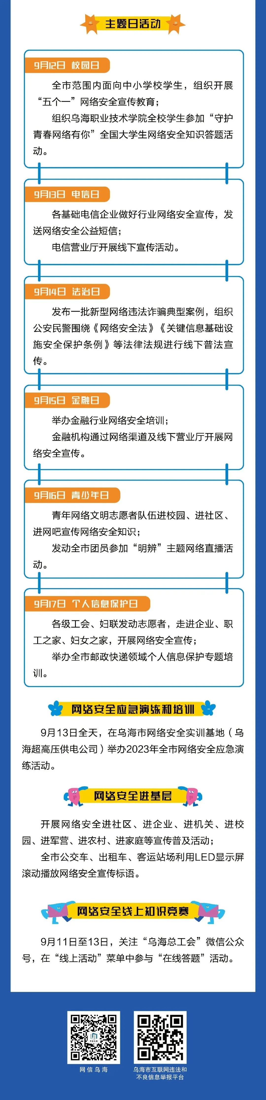 9月12日至9月17日,乌海市将陆续组织开展“六大”主题日、网络安全应急演练、专题培训、线上知识竞赛、短视频展播、进基层等活动。