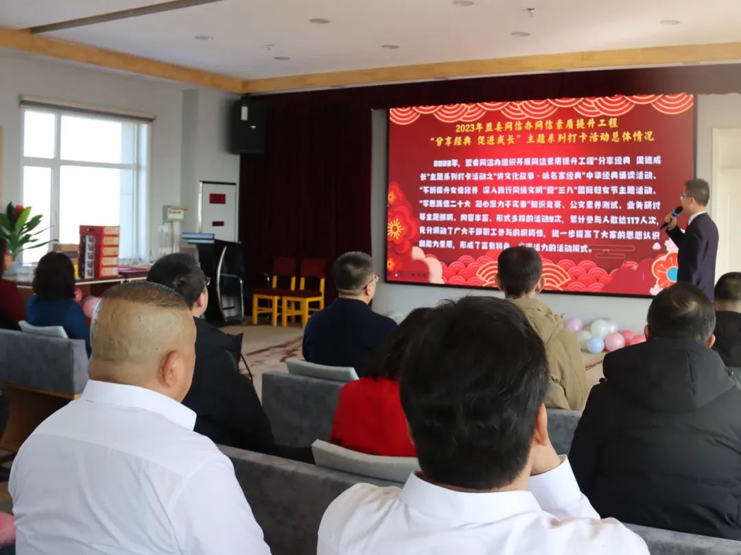 2023年,阿拉善盟委网信办组织开展网信素质提升工程“分享经典促进成长”主题系列打卡活动之“讲文化故事·咏名家经典”中华经典诵读活动、“不断提升女性修养深入践行网络文明”迎“三八”国际妇女节主题活动、“学思践悟二十大凝心聚力干实事”知识竞赛、公文素养测试、业务研讨等主题鲜明、内容丰富、形式多样的活动9次,累计参与人数达117人次,充分调动了广大干部职工参与的积极性,进一步提高了大家的思想认识和能力素质,形成了富有特色、充满活力、提质增效的活动机制。