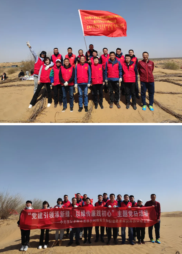最是一年春光好,义务植树正当时。为深入贯彻习近平生态文明思想,提升全体干部环保意识与廉洁意识,4月10日,鄂尔多斯市委网信办积极响应市委、市政府的号召,组织党员、干部到防沙治沙和风电光伏一体化工程一线达拉特旗恩格贝生态示范区开展一年一度的义务植树活动,并开展“党建引领添新绿、以绿传廉践初心”主题党日活动。