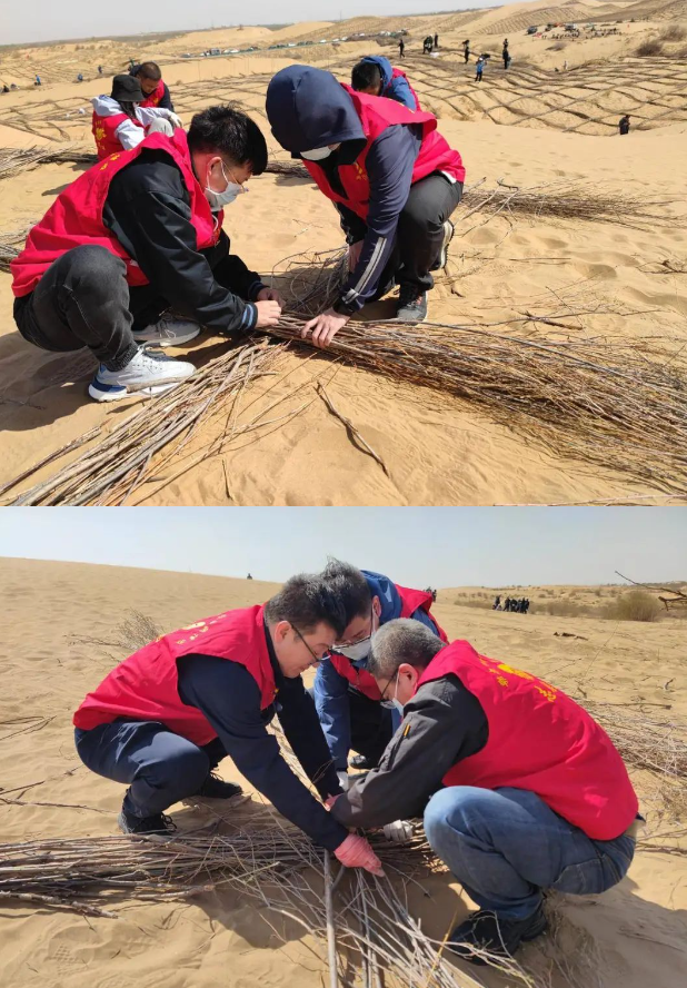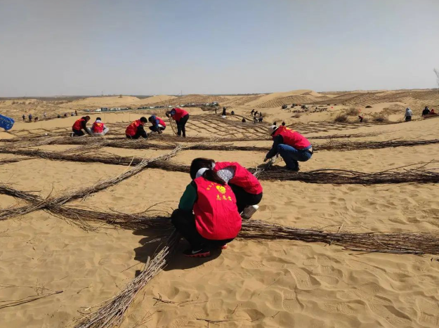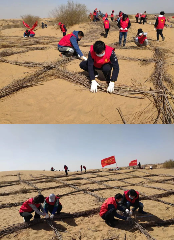 植树于行,防沙固土;植“廉”于心,防微杜渐。植树现场,红旗招展,大家热情高涨、干劲十足,两人一组、三人一伙儿,有的搬运沙柳,有的铺齐沙柳,有的用铁丝固定,每个步骤一丝不苟,整个流程井然有序,现场一派热火朝天的景象。经过一上午的辛勤劳作,标准的草方格沙障从无到有渐次铺开,迅速连成一片,为暖城大地披上了一层风沙“防护服”,成为防沙固沙的坚实屏障。