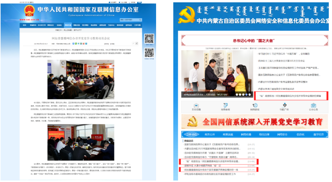 过去一年,阿拉善盟委网信办坚持以习近平新时代中国特色社会主义思想,特别是习近平总书记关于网络强国的重要思想为指导,紧紧围绕全盟中心工作,紧密结合职能职责以及自治区党委和盟委(扩大)会议精神贯彻落实、创新经验做法、制度化和规范化建设、网信基础业务和互联网新技术新应用的研究探索等内容,积极报送各类信息209期。其中,被央级平台采用3篇,区级平台采用40篇,盟级平台采用7篇。此外,完成党史学习教育、疫情防控等重大专题信息约稿任务。切实以专业、优质、高效的信息服务为全盟经济社会高质量发展提供强大的网络舆论支持、可靠的网络安全保障和有力的信息化支撑。