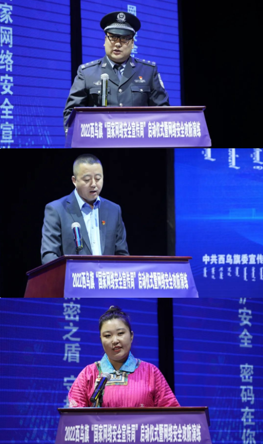 启动仪式在庄严的国歌声中拉开帷幕,旗工信局副局长郭海军对全旗工控企业网络安全提出具体要求,旗公安局警支大队教导员王晓晶对网络安全执法工作发出倡议,互联网行业企业代表李国伟对互联网行业企业落实网络文明、网络安全情况进行发言,自媒体网络人士代表哈斯萨日盖代表全旗网民作表态发言。