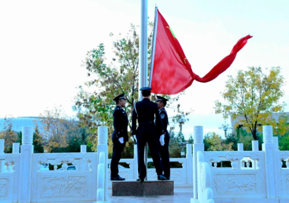迎着清晨的阳光,英姿飒爽的护旗仪仗队员护卫国旗,迈着铿锵的步伐,阔步走向国旗台。伴随着激昂的国歌,鲜艳的五星红旗冉冉升起,全体人员整齐列队,肃穆而立,向国旗行注目礼,以饱满的热情和昂扬的斗志表达对祖国的无限热爱和忠诚。