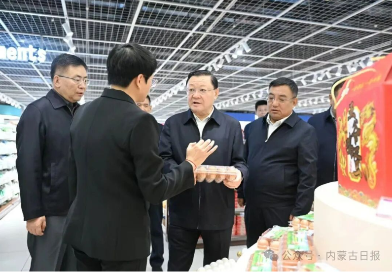 节日期间的美通批发市场车水马龙,王伟中来到这里,走进食全食美超市,详细询问商品产地、存储、价格、运销等情况。他说,民以食为天,食以安为先。要强化重要民生商品供应保障,严格源头追溯、严把质量关口,加强食品安全监管,保障好人民群众的“菜篮子”、“米袋子”、“果盘子”,守护好“舌尖上的安全”。我们内蒙古农牧业资源富集,要支持和引导相关企业聚焦“有特色、高品质”目标,主动适应市场需求,延伸产业链条,提高产品附加值,更好满足人民群众对高品质生活的追求,有效带动农牧民增收致富。