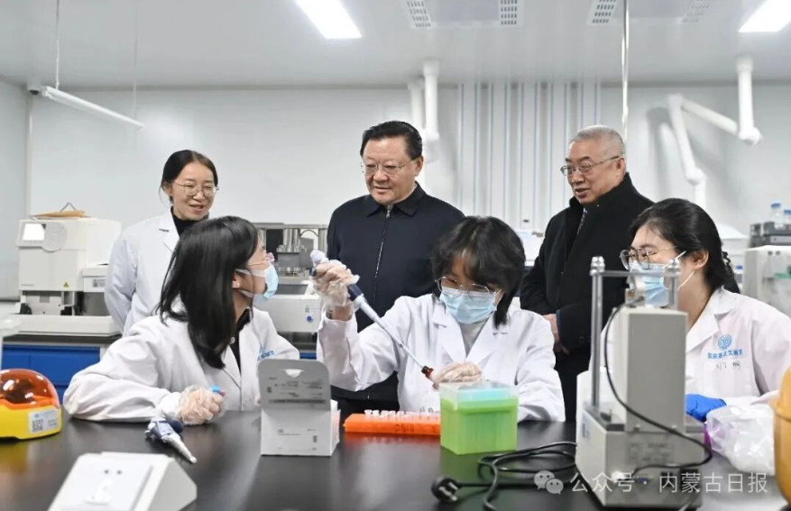 12月16日,自治区党委书记王伟中在省部共建草原家畜生殖调控与繁育国家重点实验室了解生物育种研发进展情况。草原云·内蒙古新闻网记者 马建兵 摄