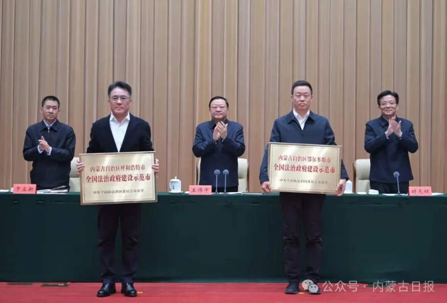 自治区党委副书记、自治区党委全面依法治区委员会副主任时光辉主持会议。自治区党委、人大常委会、政府、政协有关领导同志和法检“两长”出席。会议为自治区获评第三批全国法治政府建设示范地区的呼和浩特市、鄂尔多斯市授牌。