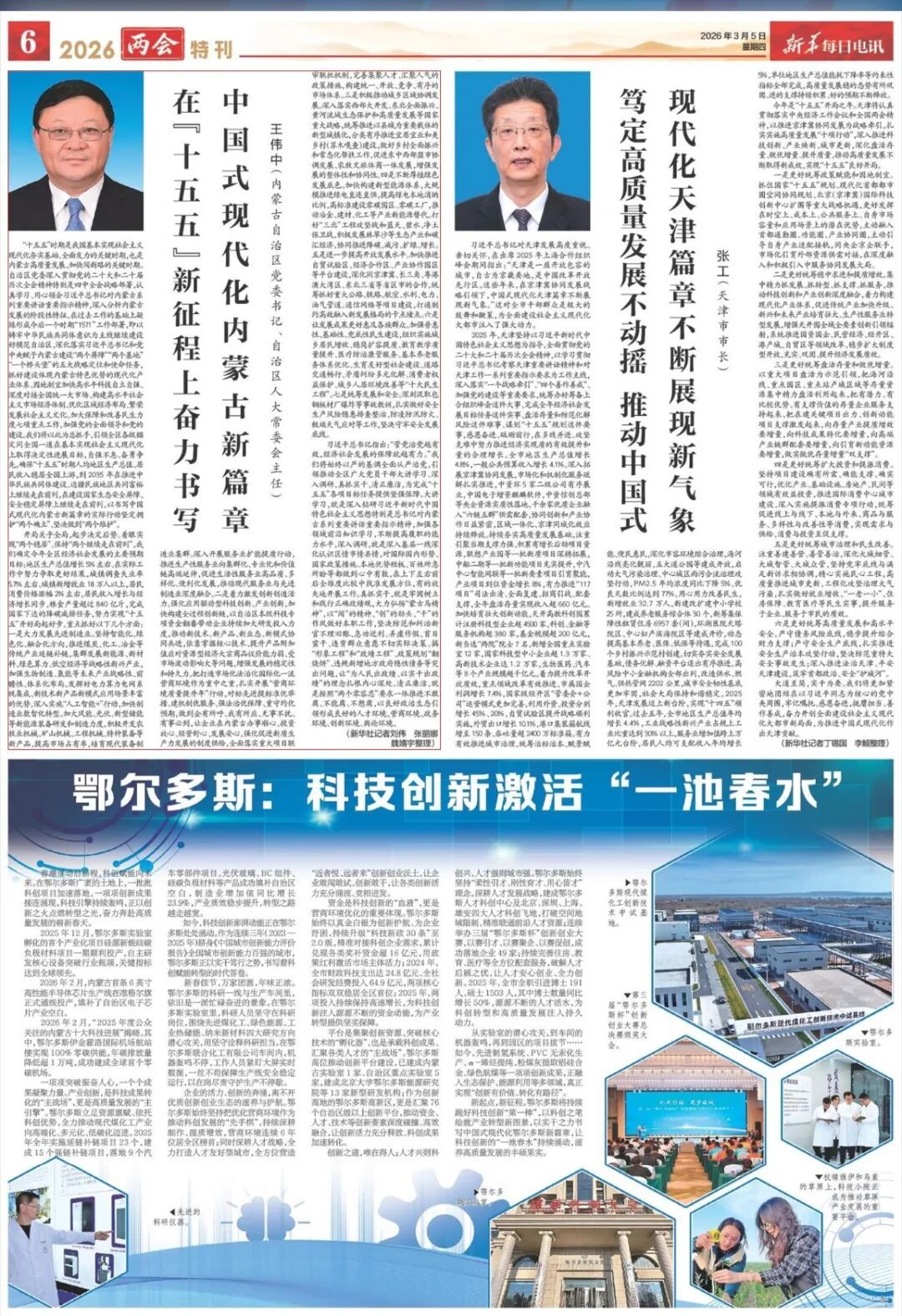 3月5日,《新华每日电讯》刊发内蒙古自治区党委书记、自治区人大常委会主任王伟中署名文章《在“十五五”新征程上奋力书写中国式现代化内蒙古新篇章》。