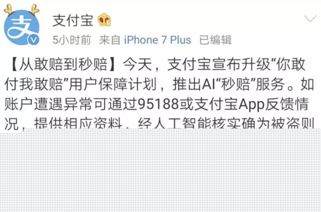 同日,支付宝也在微博发布消息称,如账户遭遇异常可通过95188或支付宝App反馈情况,提供相应资料,经人工智能核实确为被盗则自动理赔,资金秒到账,该项服务已试运行。