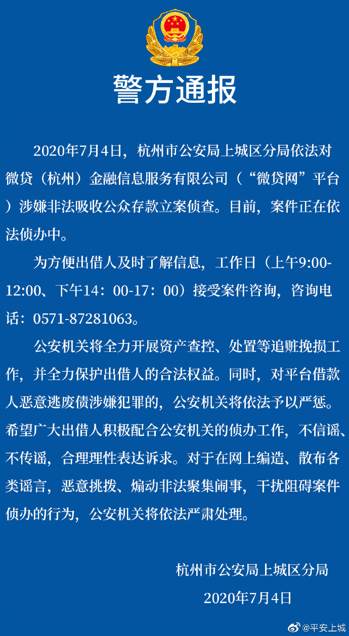 此外,杭州市公安局上城分局还发布“微贷网”网贷平台借款催收公告称,为保护广大出借人合法权益,杭州市上城区防范金融暨网络借贷风险处置领导小组办公室(下称处置办)现配合公安机关开展追赃挽损工作,敦促通过微贷网进行借款且尚未还款的借款人(下称平台借款人)积极主动归还借款。