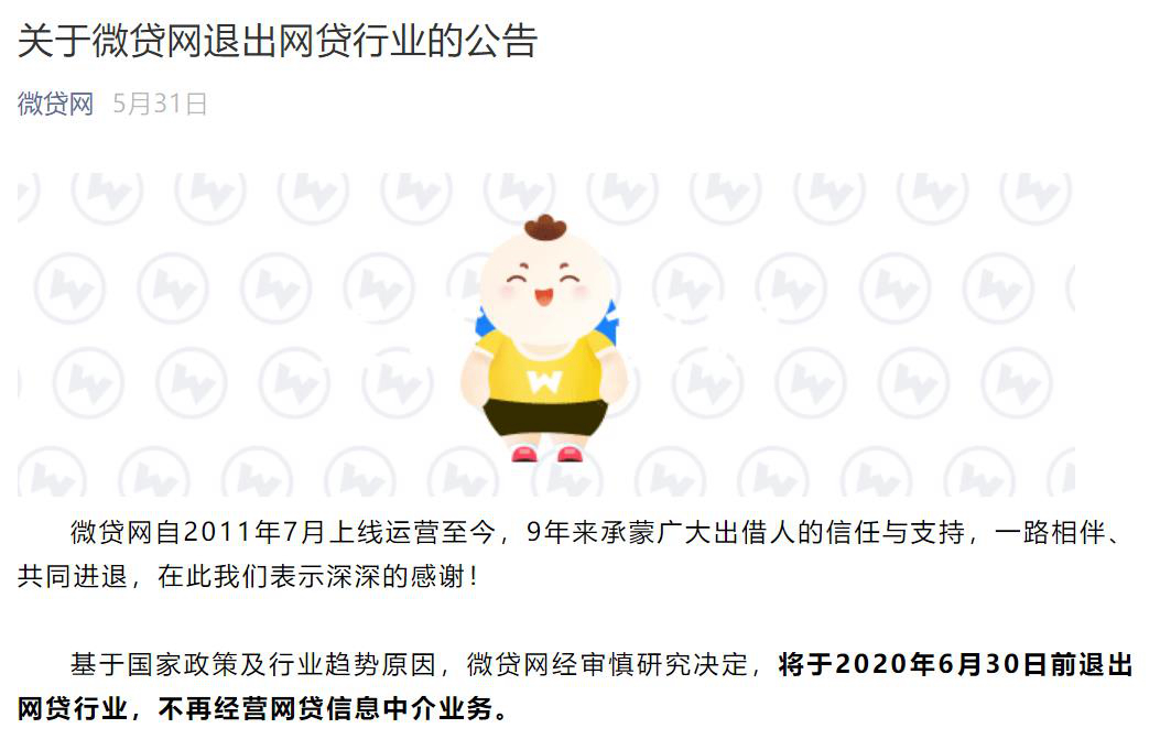 需要一提的是,5月31日,微贷网在其官方微信号中公告称,基于国家政策及行业趋势原因,微贷网经审慎研究决定,于2020年6月30日前退出网贷行业,不再经营网贷信息中介业务。