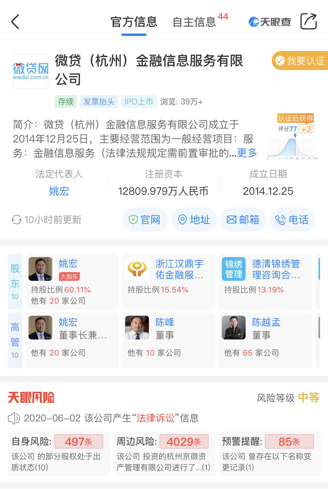 据天眼查,微贷(杭州)金融信息服务有限公司周边风险高达4029条,自身风险达497条。自身风险中,开庭公告149条,案由包括金融不良债权追偿纠纷、服务合同纠纷、不当得利纠纷、民间借贷纠纷等。法律诉讼中,因金融不良债权追偿纠纷而起诉他人或公司的达到202条。