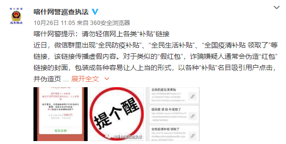 近日,新疆喀什地区有微信群发布以“防疫补贴”为名的红包链接引发关注。