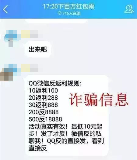 不法分子一般在QQ群或微信群发布高额返现的虚假信息,然后以虚假成功返利截图为诱饵吸引网友参与,一旦发送红包后,不法分子则以“手续费”“转账费”“红包费”等多种借口进行诈骗,或直接将对方删除、拉黑。因此,不要相信“以一返十”等返利活动,如有陌生人加你好友,一定要注意核实身份,谨慎交友,更不要给陌生人转账。