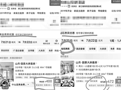——在某在线旅游平台上,四川省某地同一酒店的同等房型的客房,享有8.5折优惠的钻石会员手机页面上显示的客房原价为728元,优惠后价格为472元。但享受9.5折优惠的黄金会员手机页面上,该房型的原价为668元,折后价格是400元。同时,若是铂金会员享有的价格也比黄金会员享有的房价高出几十元。