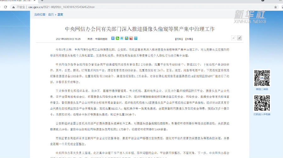8月9日,中央网信办发布公告,会同工业和信息化部、公安部、市场监管总局,深入推进摄像头偷窥等黑产集中治理工作。