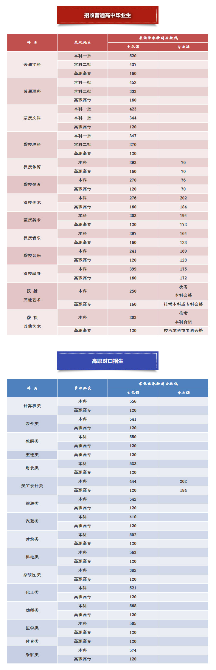 7月23日,内蒙古自治区教育招生考试中心公布内蒙古2020年高考分数线,其中普通文科本科一批录取最低控制分数线为520分、普通理科本科一批录取最低控制分数线为452分,详细各批次最低录取控制分数线请查看图表: