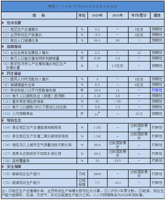 此外,“十四五”时期经济社会发展主要目标,设置经济发展、创新驱动、民生福祉、绿色生态、安全保障五大类20项,