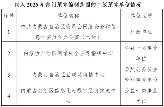 2.从预算单位构成看,纳入本部门2026年部门汇总预算编制范围的预算单位共计4家,具体包括:中共内蒙古自治区委员会网络安全和信息化委员会办公室(本级)、内蒙古自治区网络安全应急指挥中心、内蒙古自治区互联网舆情中心、内蒙古自治区信息化与数字经济推进中心。详细情况见表: