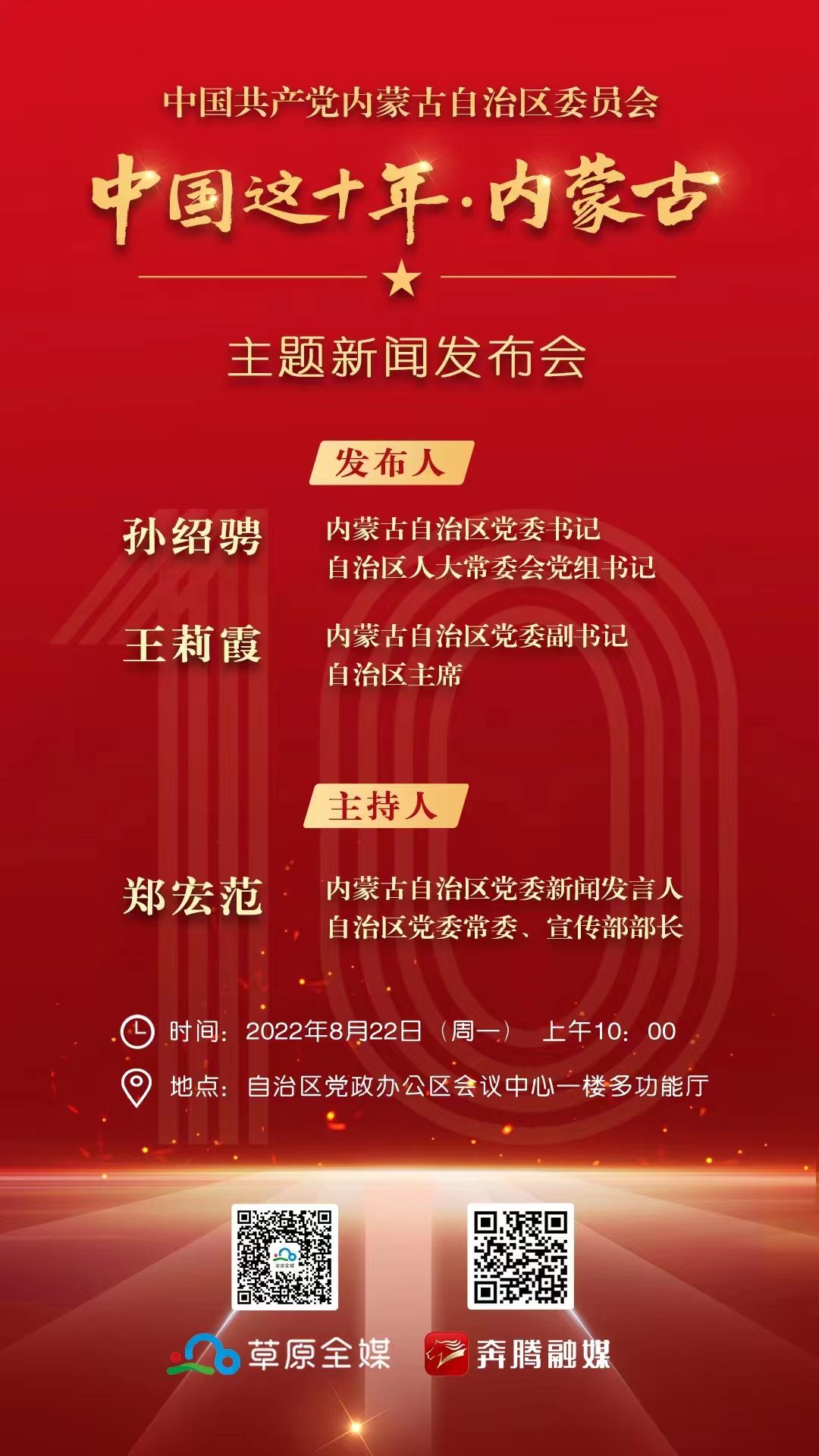 2022年8月22日(周一)上午10:00,中国共产党内蒙古自治区委员会将在自治区党政办公区会议中心一楼多功能厅举行“中国这十年·内蒙古”主题新闻发布会。