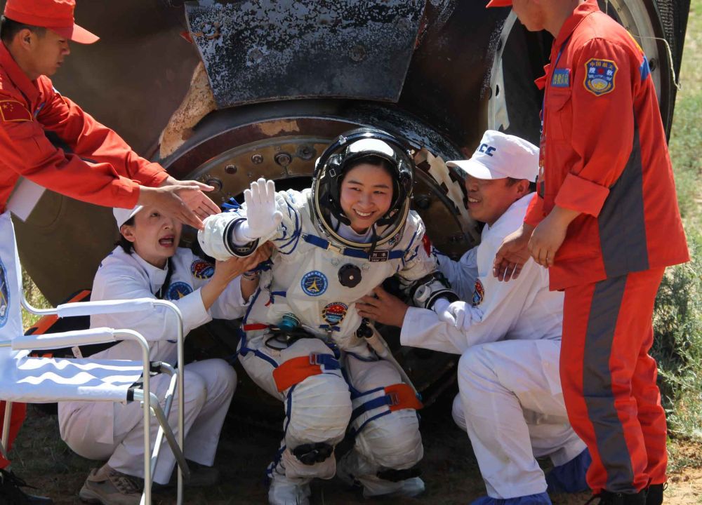 神舟九号飞船返回舱成功降落在位于内蒙古中部的主着陆场预定区域,航天员刘洋安全出舱(2012年6月29日摄)。新华社记者王建民摄