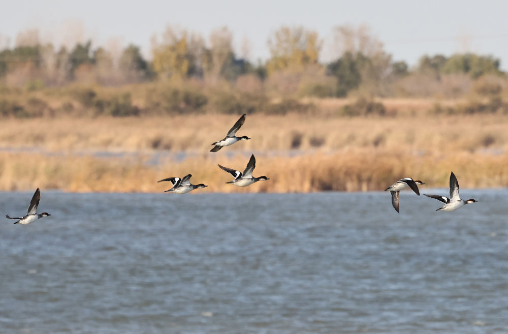 2023年11月12日,在黄河三角洲国家级自然保护区,越冬候鸟在飞翔。新华社记者徐速绘摄