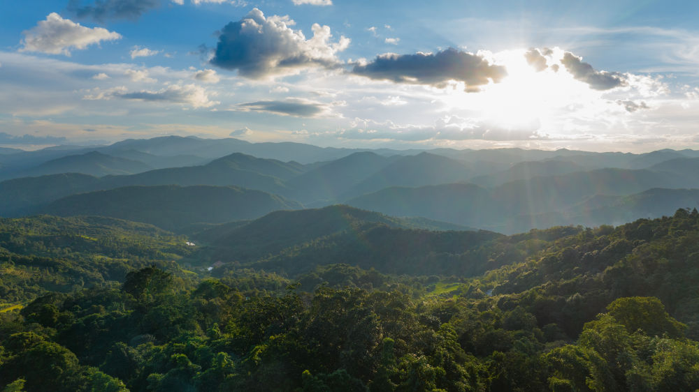 这是2023年9月16日拍摄的日落时分的云南普洱景迈山风光(无人机照片)。新华社记者胡超摄
