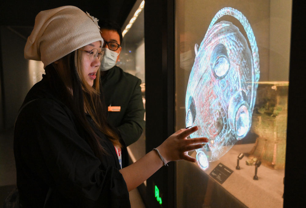 2023年9月15日,观众在位于北京奥林匹克公园核心区的中国考古博物馆内体验互动屏幕。新华社记者李贺摄