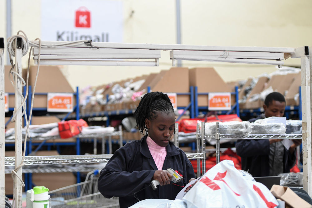 2023年7月28日,在肯尼亚姆洛隆戈,湖南长沙非拓信息技术有限公司旗下电商平台Kilimall的员工在仓库内分拣货物。新华社记者 李亚辉摄