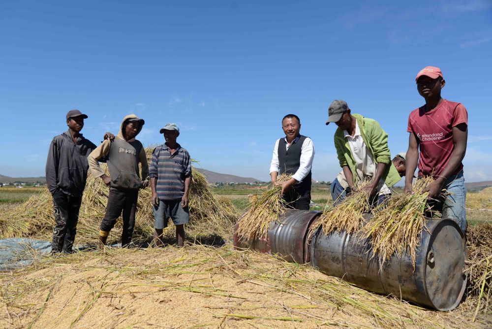 在马达加斯加首都塔那那利佛附近的马义奇镇,中国杂交水稻技术专家胡月舫(右三)在中国国家杂交水稻工程技术研究中心非洲分中心的试验田里和当地农民一起收获水稻(2023年5月12日摄)。新华社发(西塔卡·拉乔纳里松摄)