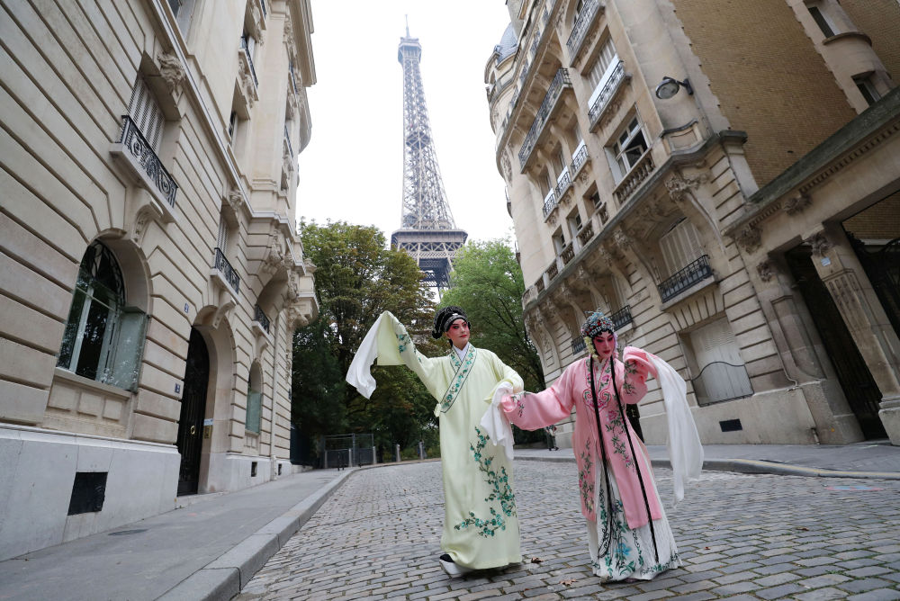 2023年9月13日,江苏省演艺集团昆剧院院长施夏明(左)和江苏省演艺集团昆剧院国家一级演员孔爱萍在法国巴黎埃菲尔铁塔附近参加昆曲快闪。新华社记者 高静摄