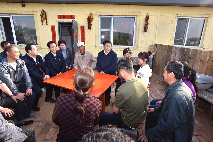 2019年4月15日,习近平在重庆市石柱土家族自治县中益乡华溪村村民、老党员马培清家中,同村民代表、扶贫干部围坐院中,共话脱贫攻坚。新华社记者 谢环驰 摄