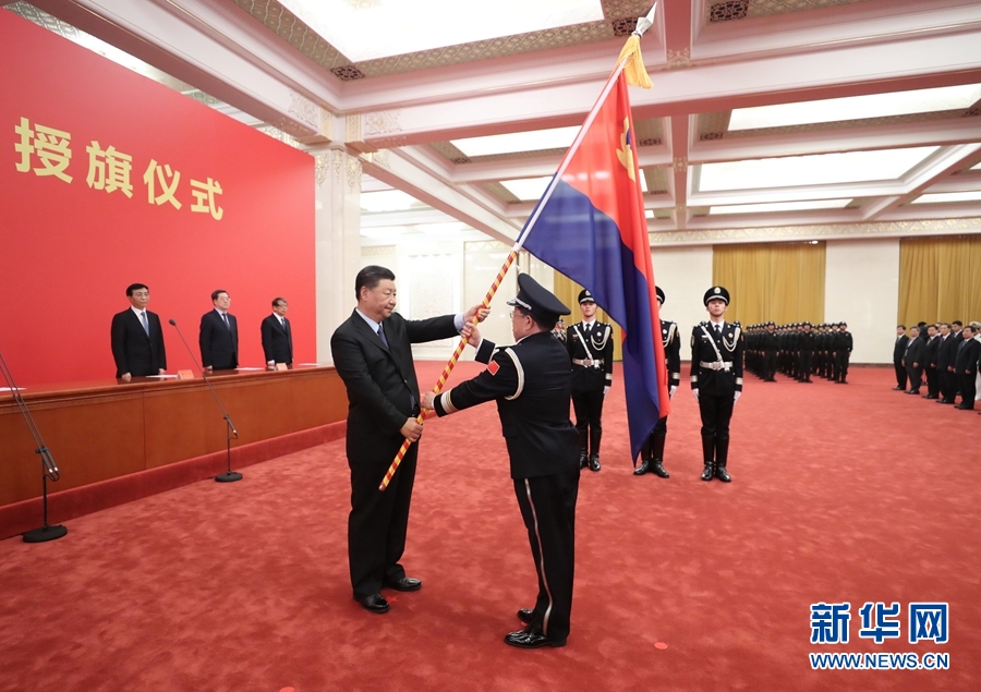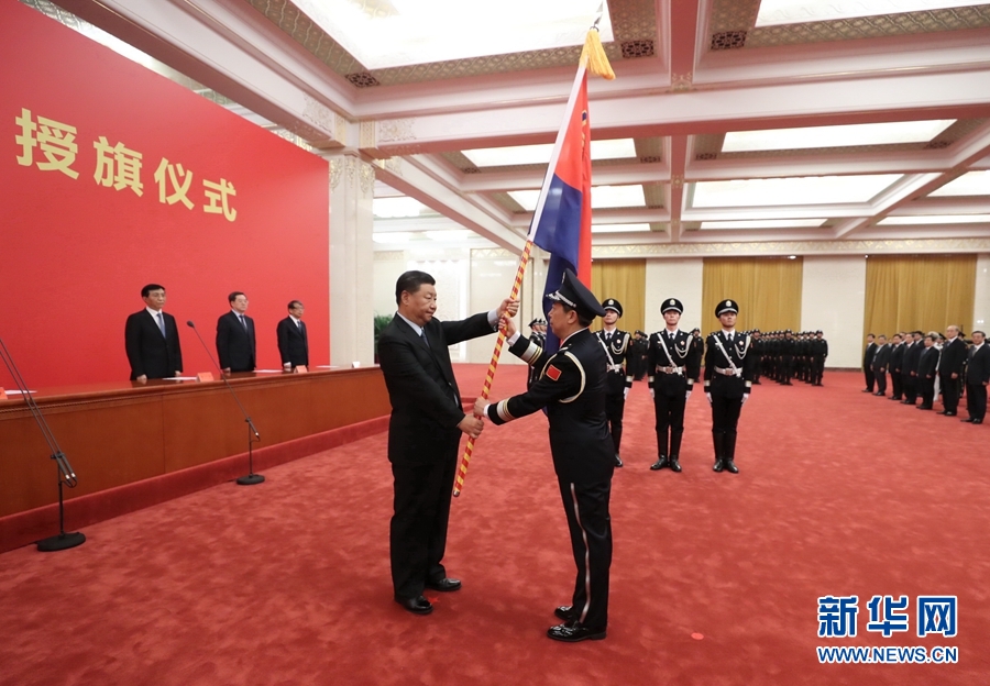 8月26日,中国人民警察警旗授旗仪式在人民大会堂举行。中共中央总书记、国家主席、中央军委主席习近平向中国人民警察队伍授旗并致训词。这是习近平向中国人民警察队伍授旗。 新华社记者 鞠鹏 摄