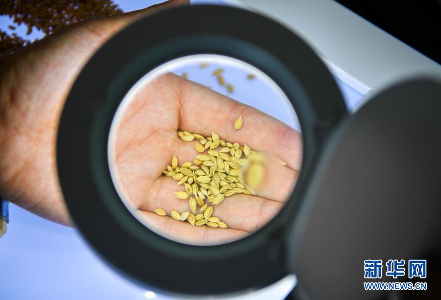 在吉林省吉林市永吉县一拉溪镇九月丰家庭农场,工作人员在实验室中检测一批试种水稻的稻谷外观(8月12日摄)。新华社记者 许畅 摄