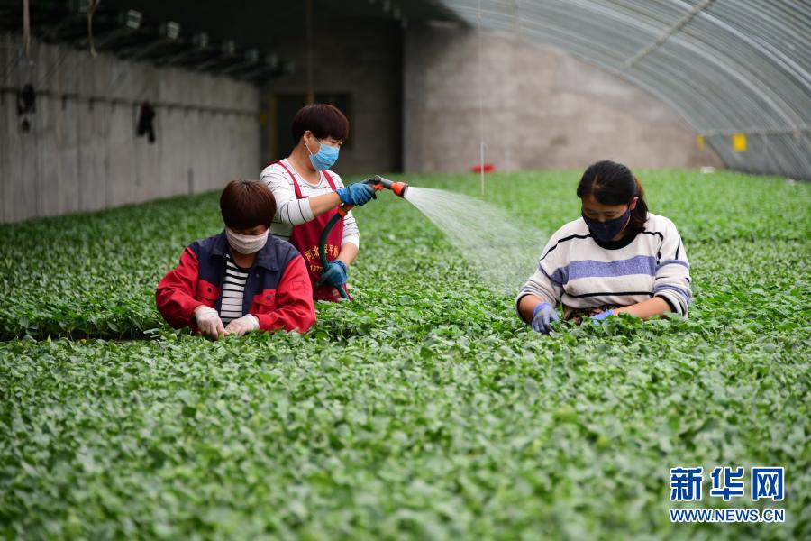 河北曲周县一家育苗产业基地的工人在育苗温棚内工作(5月4日摄)。曲周县积极拓宽产业扶贫渠道,发挥当地产业优势,统筹协调贫困户利用扶贫资金入股现代设施农业基地,带动群众脱贫增收。新华社记者 朱旭东 摄