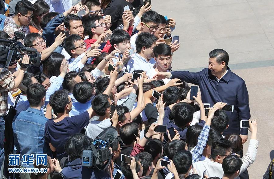 2018年5月2日,中共中央总书记、国家主席、中央军委主席习近平来到北京大学考察。这是习近平离开学校时同道路两旁师生亲切握手。新华社记者王晔摄