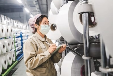 江苏省宿迁市泗阳县近年来加快推动纺织企业生产数字化转型,实现高质量发展。图为江苏芮邦科技有限公司生产车间内,工人在智能化生产线上作业。 裴成摄(人民视觉)