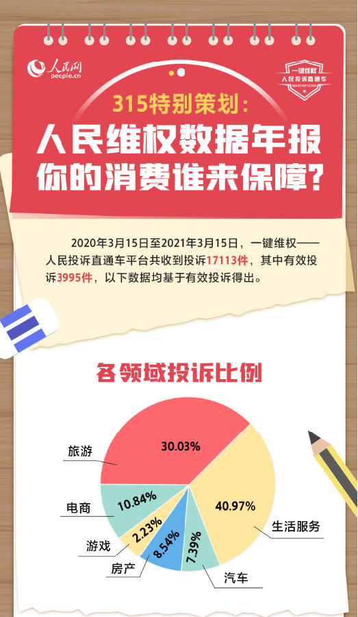 “一键维权”人民投诉直通车平台今日公布数据年报,自2020年3月15日至2021年3月15日,平台共收到投诉17113件,其中有效投诉3995件,以下数据均基于有效投诉得出。