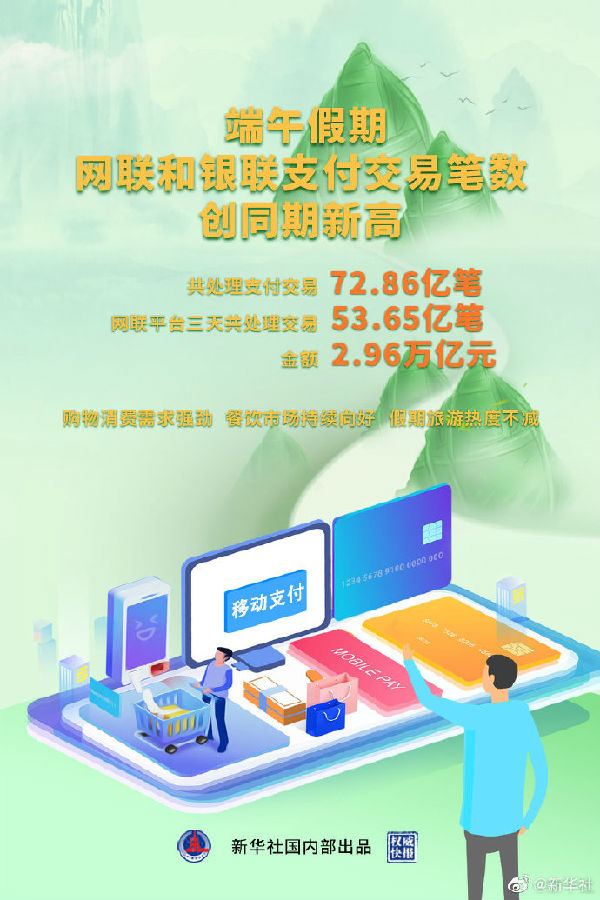 15日出炉的最新数据显示,2021年6月12日至14日,网联、银联共处理支付交易72.86亿笔,创同期新高。其中,网联平台共处理支付交易53.65亿笔,金额2.96万亿元,日均交易金额较2020年和2019年同期分别增长51%和89%。